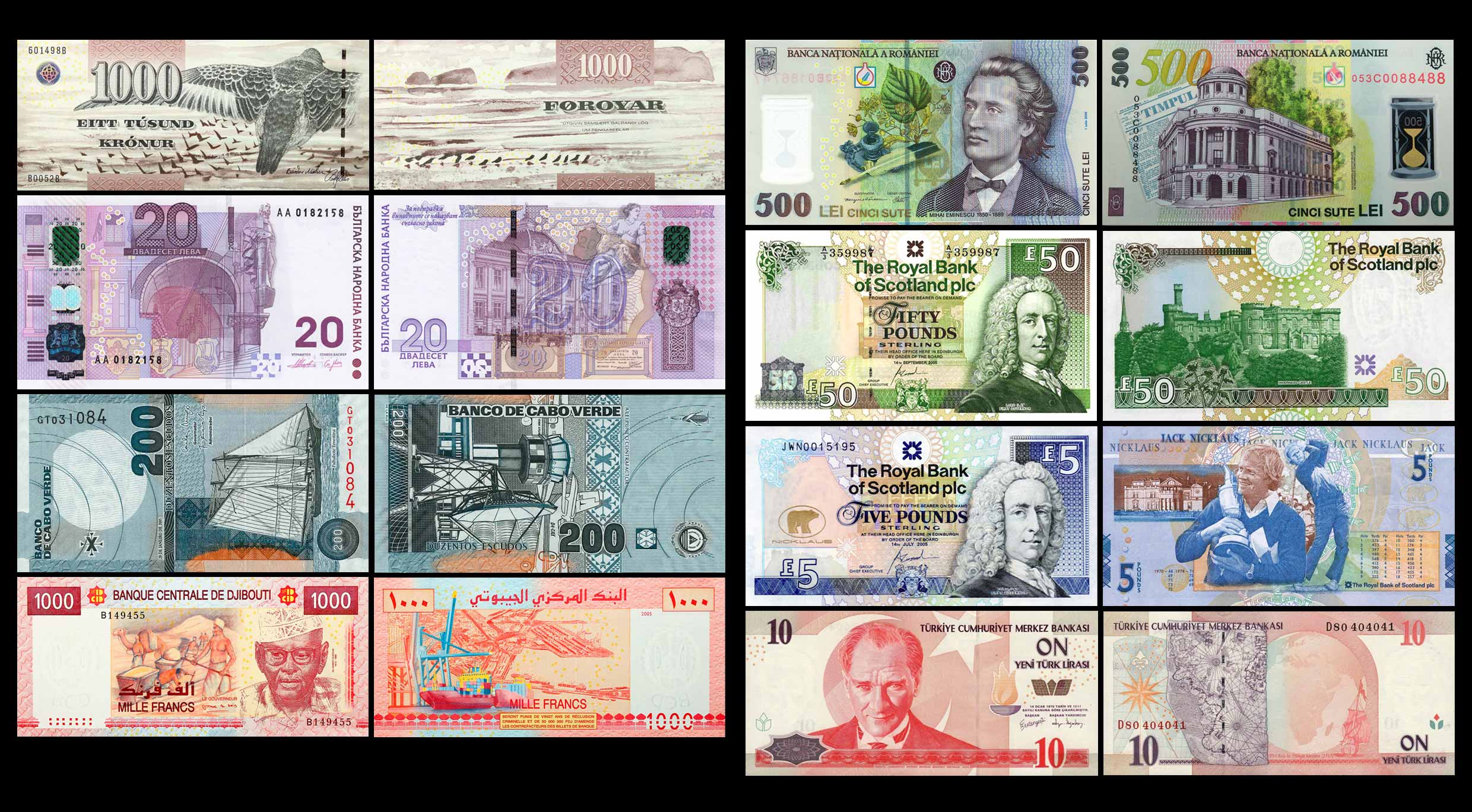 Kit com 08 cédulas (réplicas) das notas mais bonitas do mundo, segundo "Bank Note of the Year Award" de 2005.