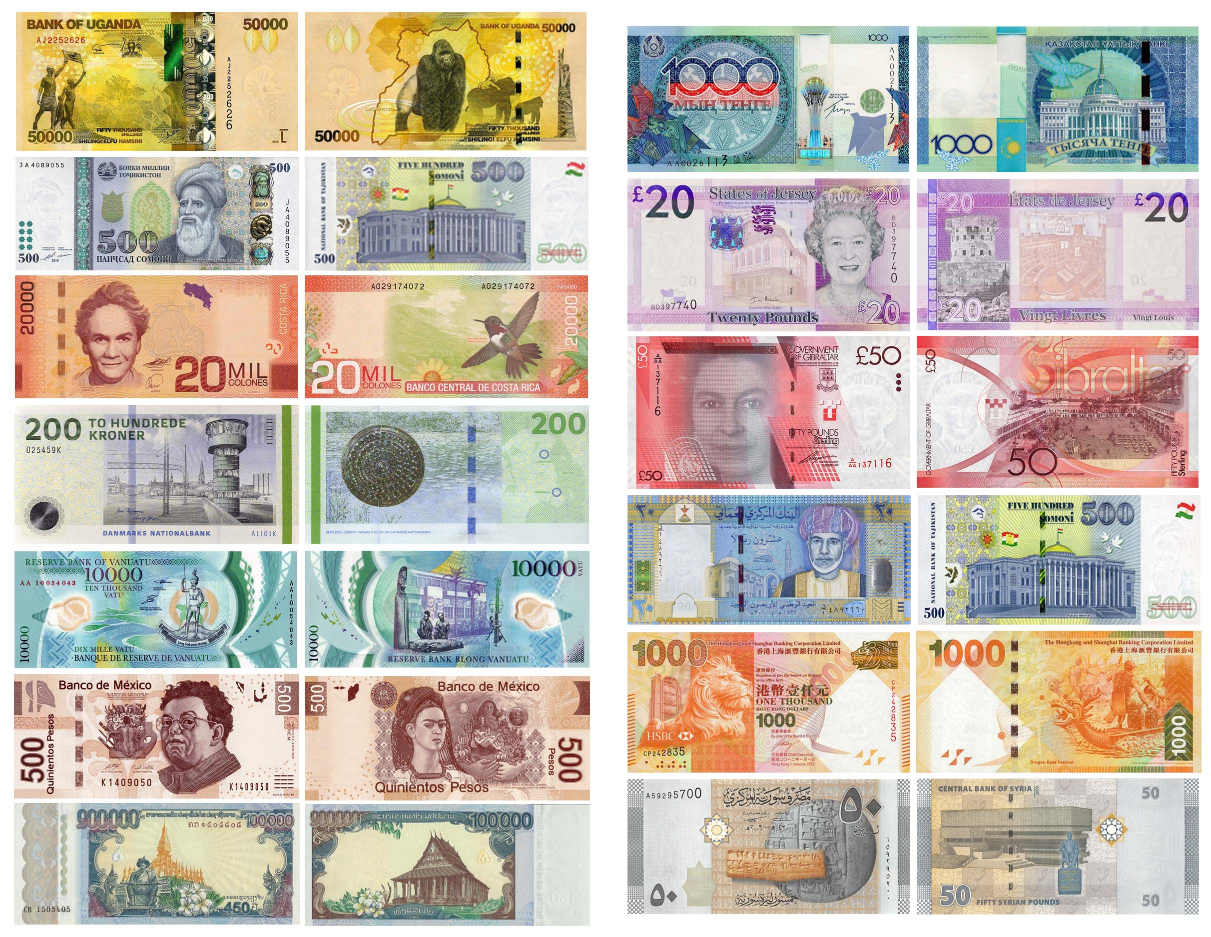 Kit com 13 cédulas (réplicas) das notas mais bonitas do mundo, segundo "Bank Note of the Year Award" de 2010.