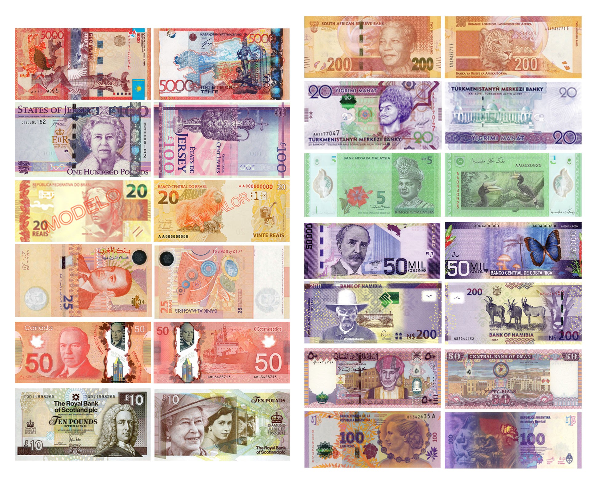 Kit com 13 cédulas (réplicas) das notas mais bonitas do mundo, segundo "Bank Note of the Year Award" de 2012.