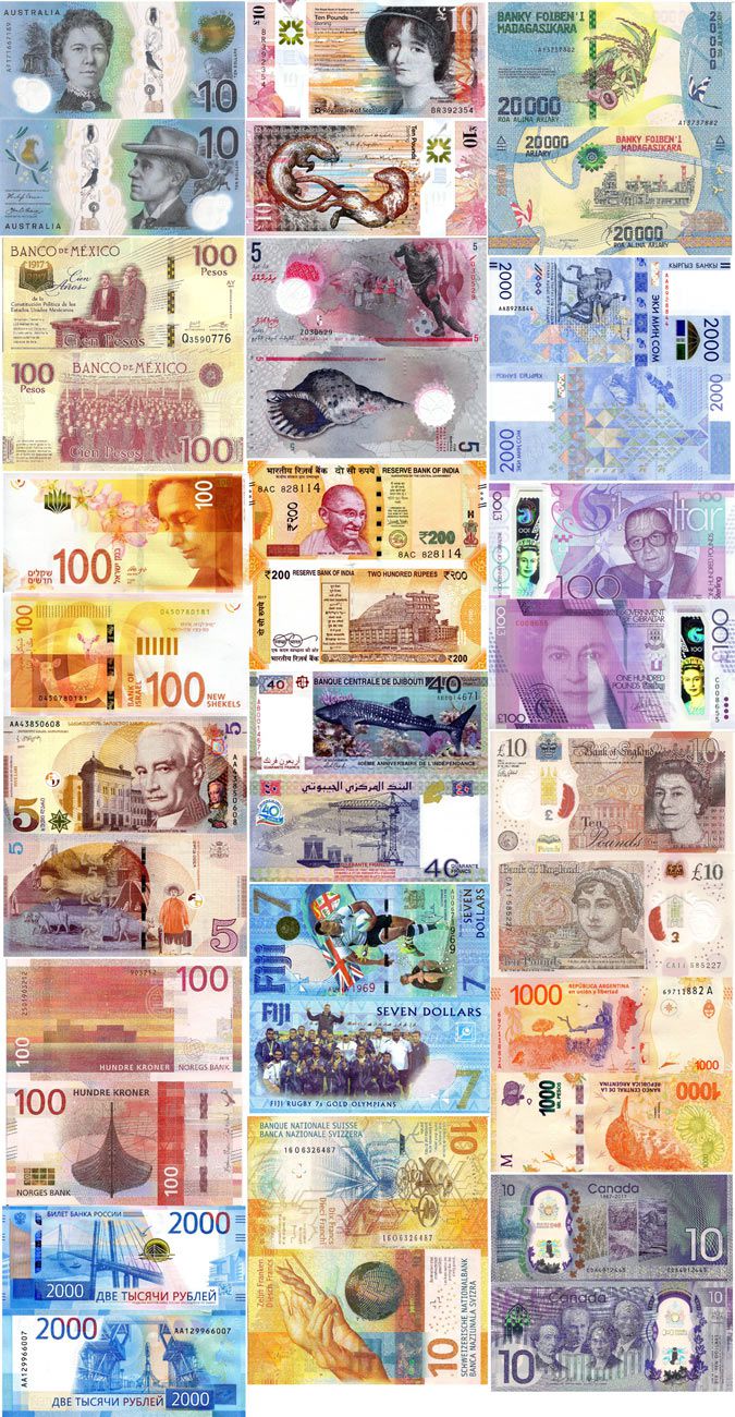 Kit com 18 cédulas (réplicas) das notas mais bonitas do mundo, segundo "Bank Note of the Year Award" de 2017.