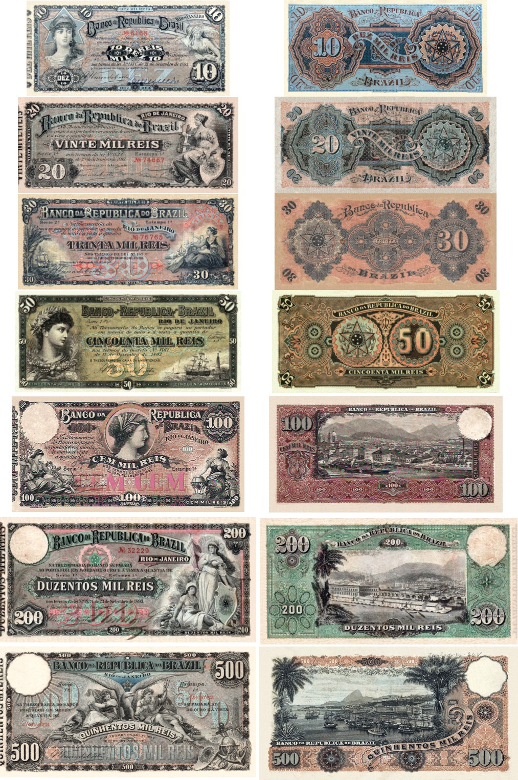 Conjunto com as réplicas de 10 Mil Reis, 20 Mil Reis, 30 Mil Reis, 50 Mil Reis, 100 Mil Reis,